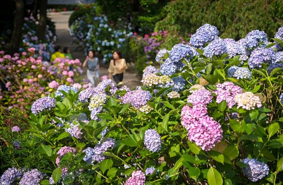 태종사 주변에 조성된 수국길에서는 약 30여 종, 5,000여 그루의 수국이 흐드러지게 피어 장관을 이룹니다.